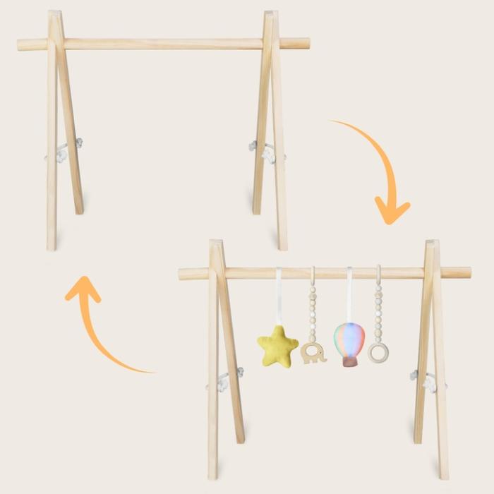 Οι διαφορετικές υφές, τα απαλά λούτρινα στοιχεία και οι ξύλινες χάντρες διεγείρουν τις αισθήσεις του μωρού, ενισχύοντας την ανάπτυξη της όρασης, της αφής και τον συντονισμό χεριού–ματιού. Το baby gym ενθαρρύνει το παιδί να σηκώνει τα χεράκια του, να πιάνει τα παιχνίδια και να κάνει τις πρώτες του ενεργητικές κινήσεις.