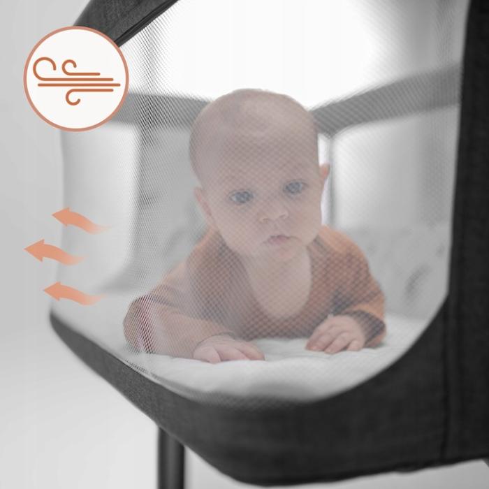 Η πολύ μεγάλη επιφάνεια από αναπνεύσιμο δίχτυ εξασφαλίζει άριστη κυκλοφορία του αέρα, συμβάλλοντας σε ένα υγιεινό και άνετο περιβάλλον ύπνου. Παράλληλα, επιτρέπει τη συνεχή οπτική επαφή με το μωρό, ώστε να το παρακολουθείτε ανά πάσα στιγμή όσο ξεκουράζεται ή κοιμάται στο λίκνο.